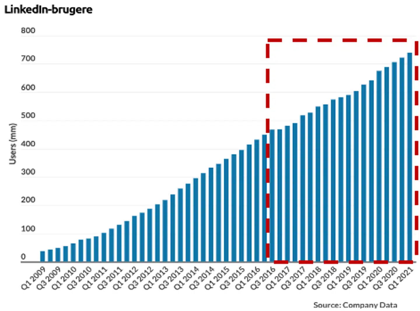 Som du kan se af nedenstående tabel, har LinkedIn nu ca. 740 millioner brugere fordelt over hele verden. Kun omkring 60% af denne værdi var skabt inden afnoteringen for omkring 5 år siden (ca. 450 millioner brugere).