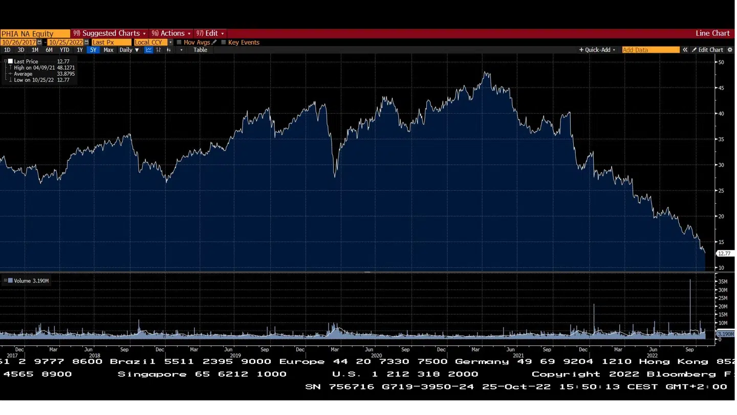 Aktiekursen (12,8 euro) er nærmest havareret efter en flot optur med 50 euro som toppunkt.