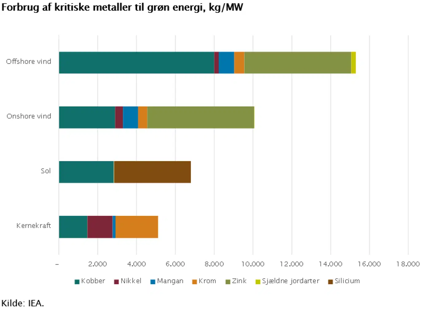 De nye teknologier kræver forskellige metaller. Litium, nikkel, kobolt, mangan og grafit er afgørende for batteriers performance, levetid og energidensitet. Sjældne jordarter er nødvendige i de magneter, som bruges i både vindmøller og EV-motorer. Aluminium og kobber er centrale i det elektriske netværk, som skal udbygges i stor stil for at få den vedvarende energi ud til slutbrugerne. Alt dette svarer til, at forbruget af de relevante metaller ifølge IEA skal seksdobles i 2040 for at nå målet om at være CO2-neutral i 2050.