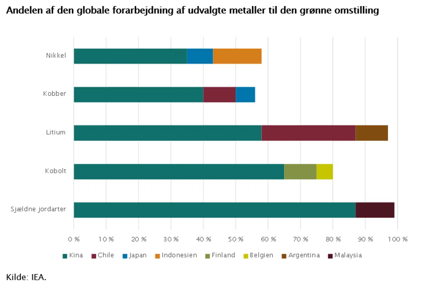Produktionen af mange af de afgørende metaller er derudover langt mere koncentreret rent geografisk, end tilfældet er med olie og gas. For litium, kobolt og sjældne jordarter kontrollerer verdens tre største producerende lande mere end 75 pct. af den globale produktion. Congo står for 70 pct. af koboltudvinding, og Kina står for 60 pct. af udvindingen af sjældne jordarter. Kina har derudover massive markedsandele af den globale forarbejdning af næsten samtlige kritiske metaller til den grønne omstilling. Afhængigheden af russisk gas bliver altså erstattet af afhængighed af kinesiske metaller, medmindre vesten selv opbygger adgang til metallerne eller oparbejder en lokal værdikæde til at genbruge råvarerne.