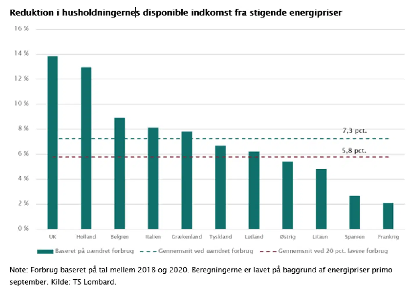 TS Lombards tal viser, at med en reduktion i energiforbruget på 20 pct., vil energiregningerne reducere husholdningernes disponible indkomst med 6 pct. Også i dette tilfælde vil forbrugerne være nødt til at spare på andre varer for at få råd til deres energiregninger.
