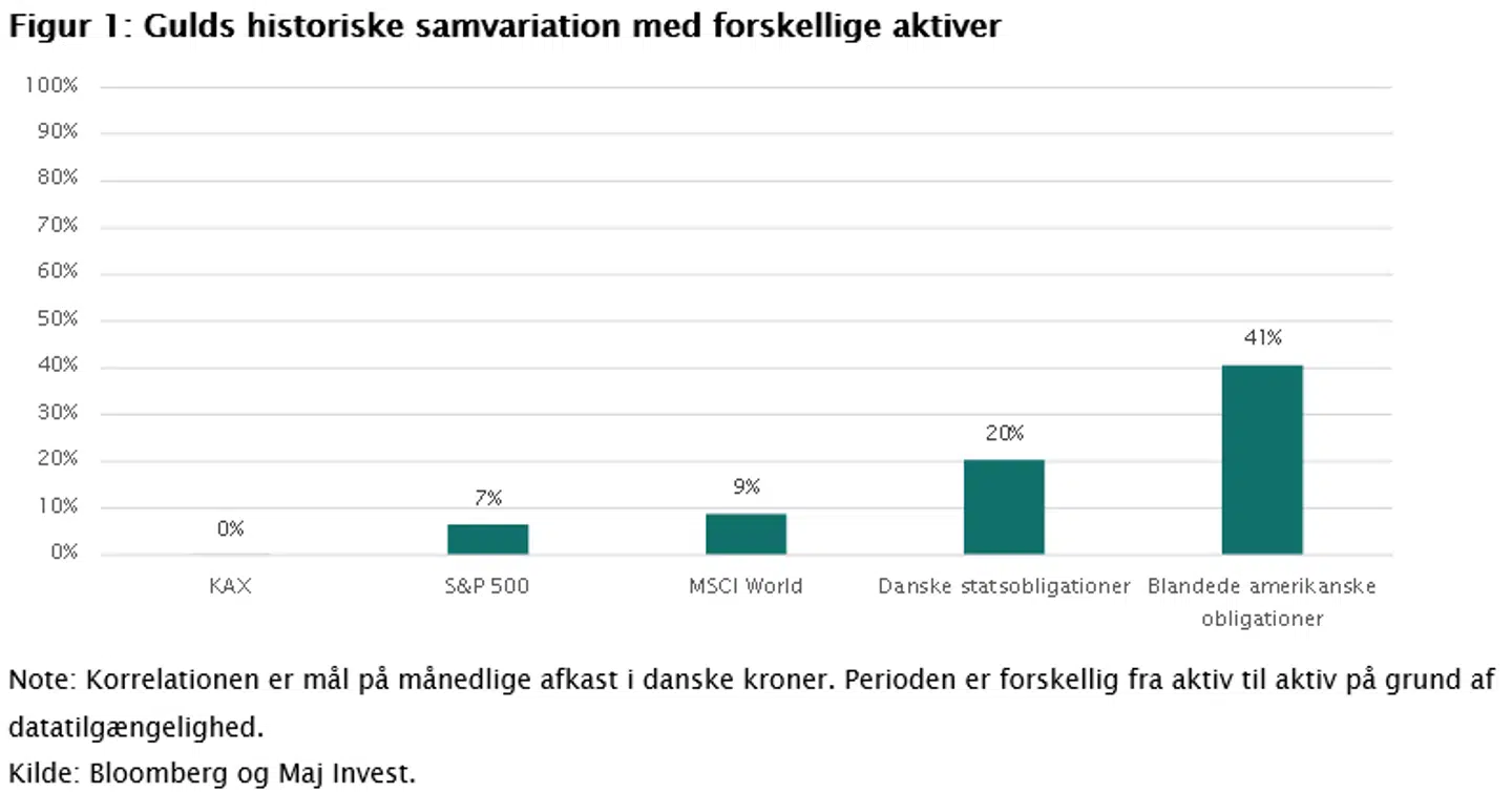 Et af guldets unikke karaktertræk er, at det ikke svinger i takt med andre aktivklasser. Det gør det interessant for investorer, der ønsker at beskytte deres formuer i tider, hvor andre aktivklasser klarer det dårligt. I figur 1 kan man se, at gulds månedlige afkast kun i meget lav grad følger aktiemarkedets afkast. Den historiske korrelation med obligationsafkast er større, men stadig i begrænset omfang. Guld har haft en stabiliserende effekt på finansielle afkast historisk.