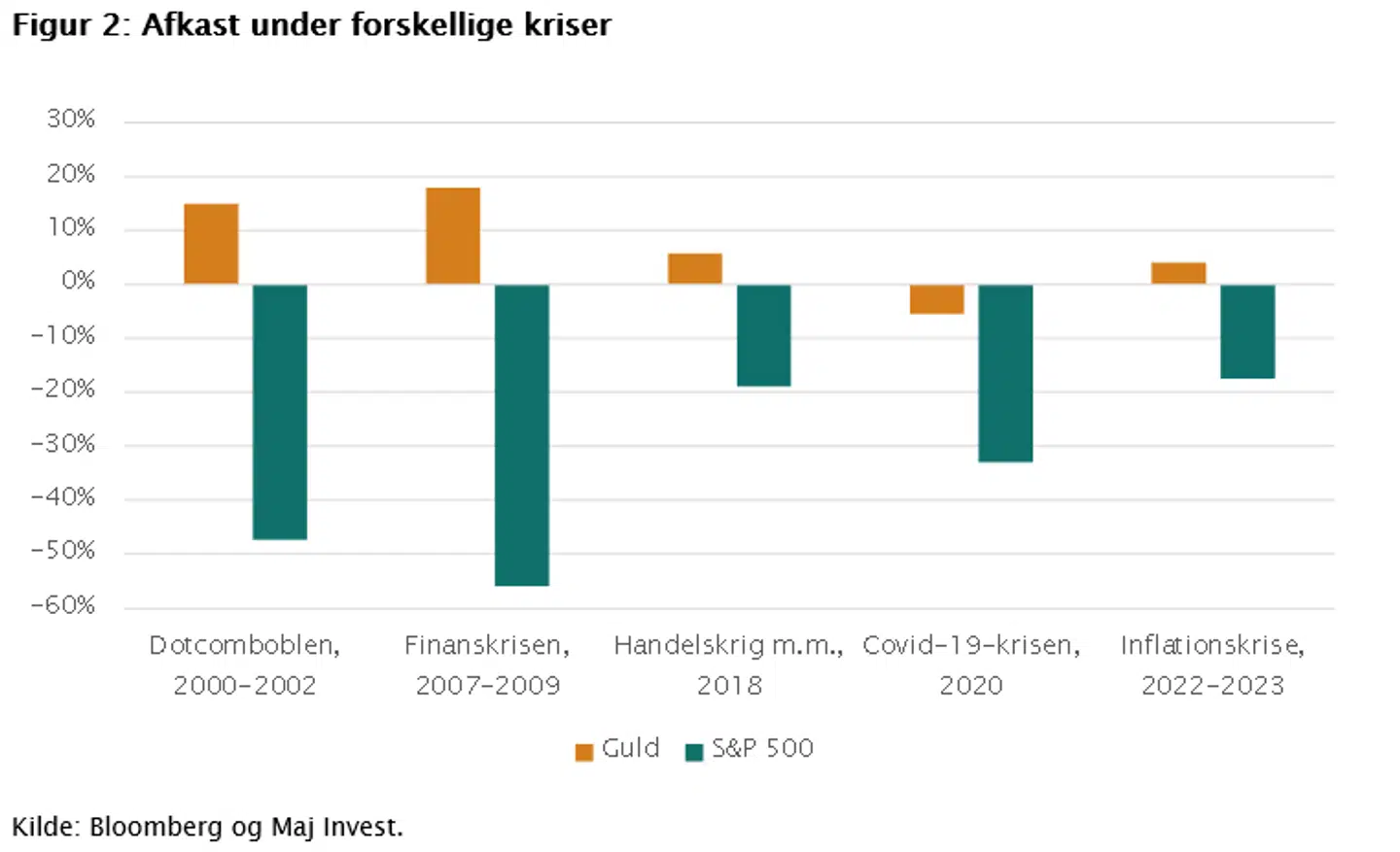 Dykker man ned i de store kriseperioder siden år 2000, bliver guldets evne til at skabe stabilitet i porteføljen endnu tydeligere – se figur 2. Skarpest står afkastforskellen under dotcomboblen og finanskrisen, hvor guld skabte flotte positive afkast, mens aktier blev halveret. De seneste år har guldet også vist sit værd på trods af større udsving – både under covid-19-krisen og den nuværende inflationskrise har guldet klaret sig markant bedre end aktiemarkedet.