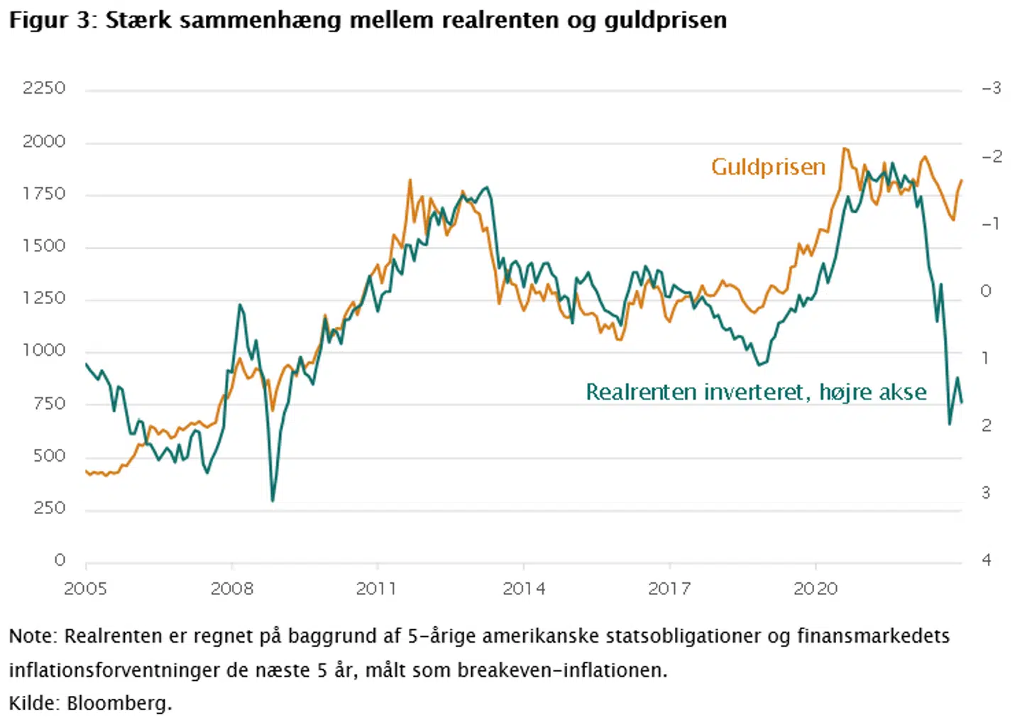 Realrenten har været den toneangivende drivkraft for udviklingen i guldet historisk – se figur 3. Realrenten udtrykker investorernes alternativ til investering i guld eller andre aktiver og udregnes som forskellen mellem den nominelle rente og inflationen. Jo lavere realrenten er, desto mere attraktiv er investering i guld, der i sig selv ikke giver løbende udbytte eller rentebetalinger. Faldende renter og stigende inflationsforventninger vil derfor være positivt for guldets udvikling.