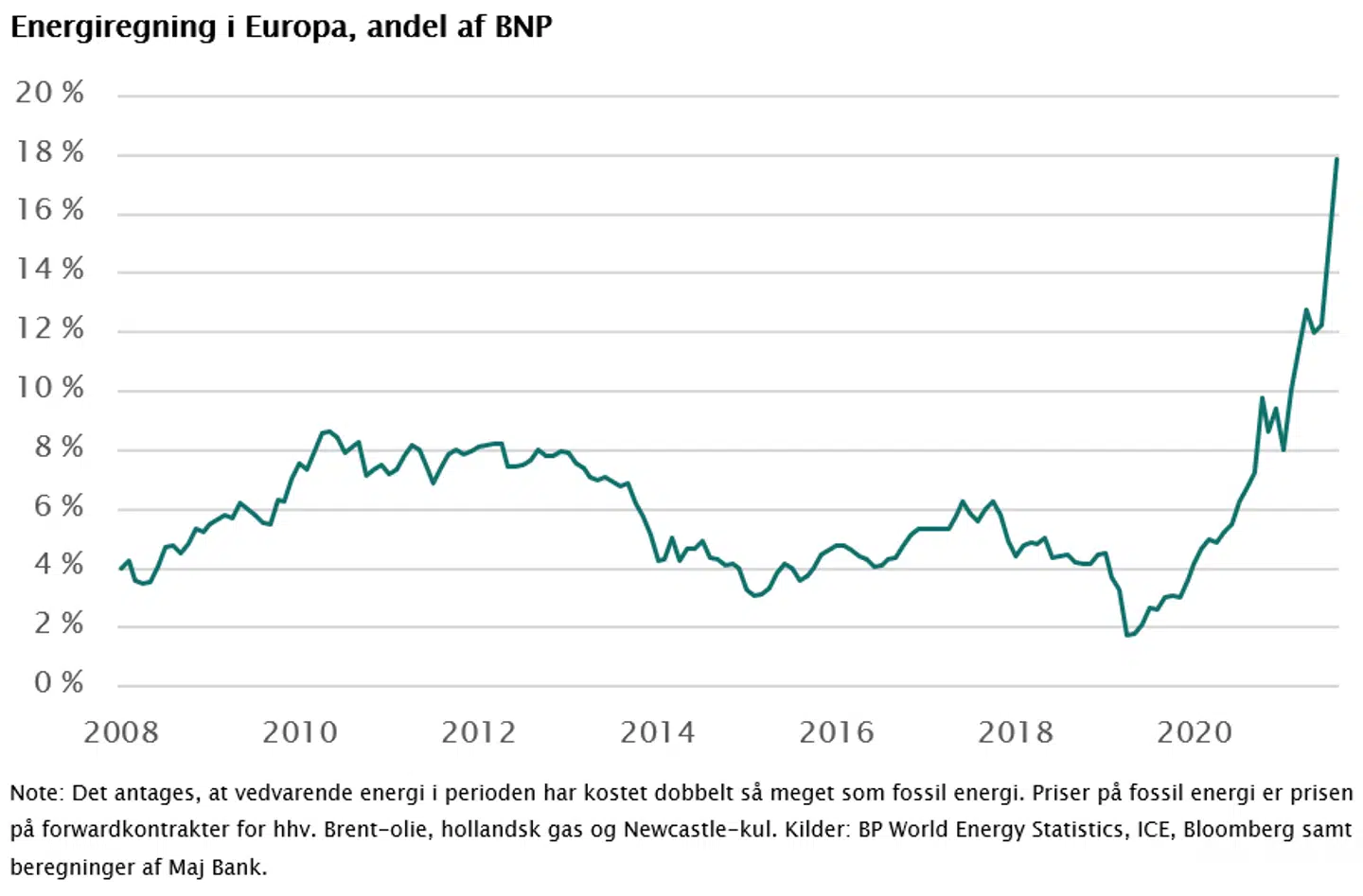 Selvom gassen ser ud til at række til denne vinter, vil økonomien allerede i det kommende år mærke konsekvenserne af energibesparelser og de høje energipriser. I perioden mellem 2014 og 2021 var den europæiske energiregning som andel af BNP omkring 4 pct. Dette er nu steget til 18 pct.