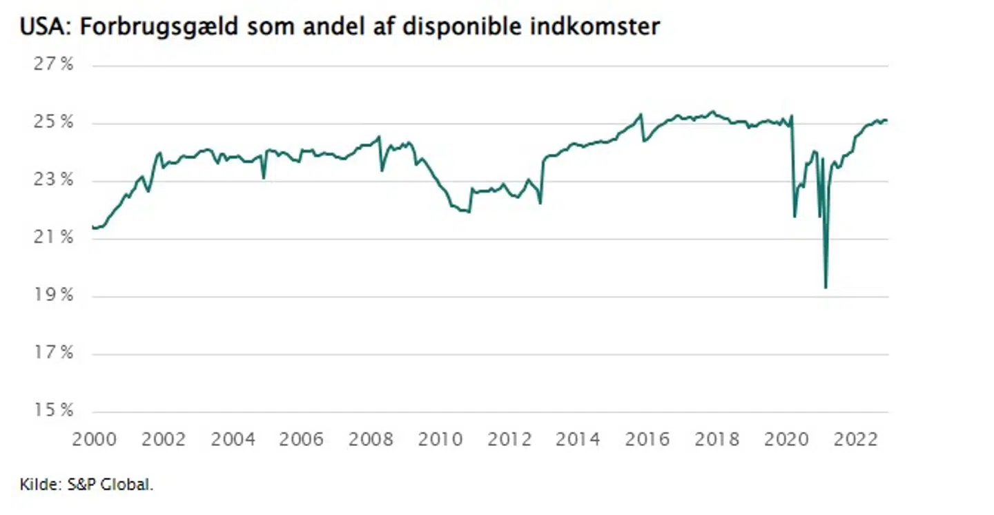 I virkeligheden er det blot en normal del af kreditcyklen og et tegn på, at den amerikanske økonomi også fremadrettet vil klare det fornuftigt og ikke har udsigt til en recession i den nærmeste fremtid. I den kontekst er det også værd at nævne, at ser man i stedet for den nominelle forbrugsgæld på udviklingen i forbrugsgælden i forhold til de disponible indkomster, er niveauet fortsat acceptabelt.