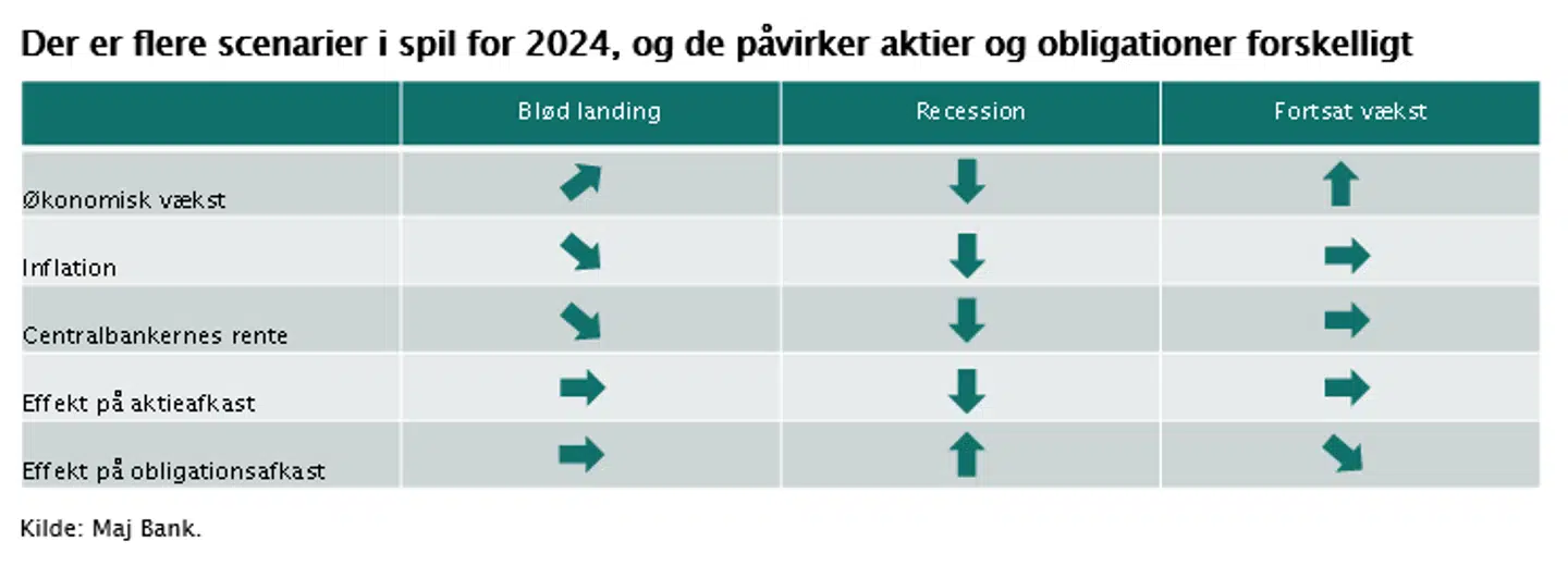 Mange glemmer i øjeblikket det tredje scenarie, nemlig at økonomien fortsætter med at vokse pænt, arbejdsmarkedet forbliver stramt, og inflationen lander lige over centralbankernes målsætning. I det scenarie vil centralbanken sænke rente i et lavere tempo, end finansmarkedet i øjeblikket forventer. Aktiekurserne skal i et sådant scenarie finde balancen mellem højere renter, der presser værdiansættelsen, og højere vækst, der øger indtjeningen. Obligationerne vil opleve modvind fra de højere markedsrenter, men den høje underliggende rente gør afkastet modstandsdygtigt.