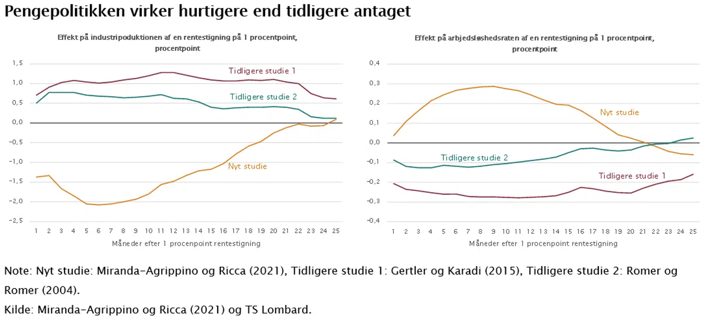 Efterfølgende studier har vist, at ændringer i pengepolitikken først slår igennem efter 12-36 måneder. Men den lange inkubationstid kan vise sig at være ændret. Et nyt studie fra Bank of England tyder nemlig på, at pengepolitikken nu rammer økonomien efter kun 6-9 måneder.