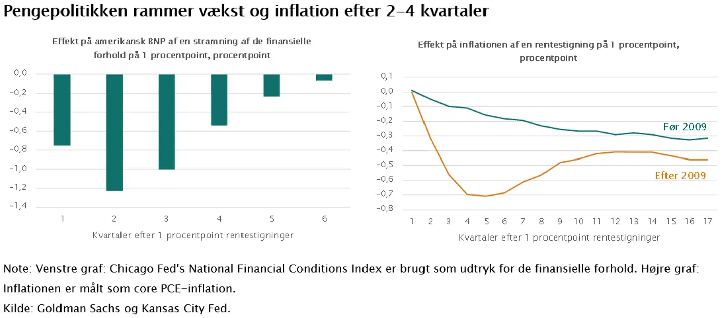 Tallene bakkes op af en analyse fra Goldman Sachs, der viser, at strammere finansielle forhold har størst effekt på BNP-væksten efter to kvartaler, ligesom Kansas City Fed kommer frem til, at effekten på inflationen i nyere tid er størst efter fire kvartaler.