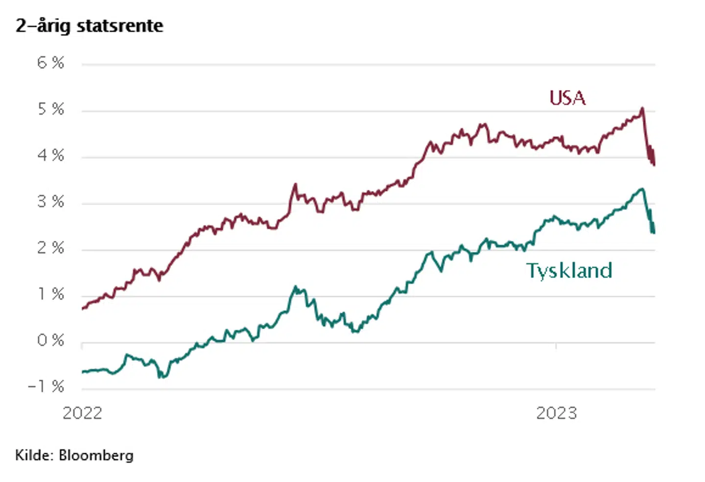 Obligationsrenterne og bankaktierne har reageret på nyhederne om problembankerne. Særligt den korte rente er faldet, dels fordi investorerne trækker indskud ud af problembankerne og placerer i korte obligationer, og dels fordi man forventer, at centralbankerne nu ikke vil stramme pengepolitikken i samme grad, på grund af den øgede risiko for recession.