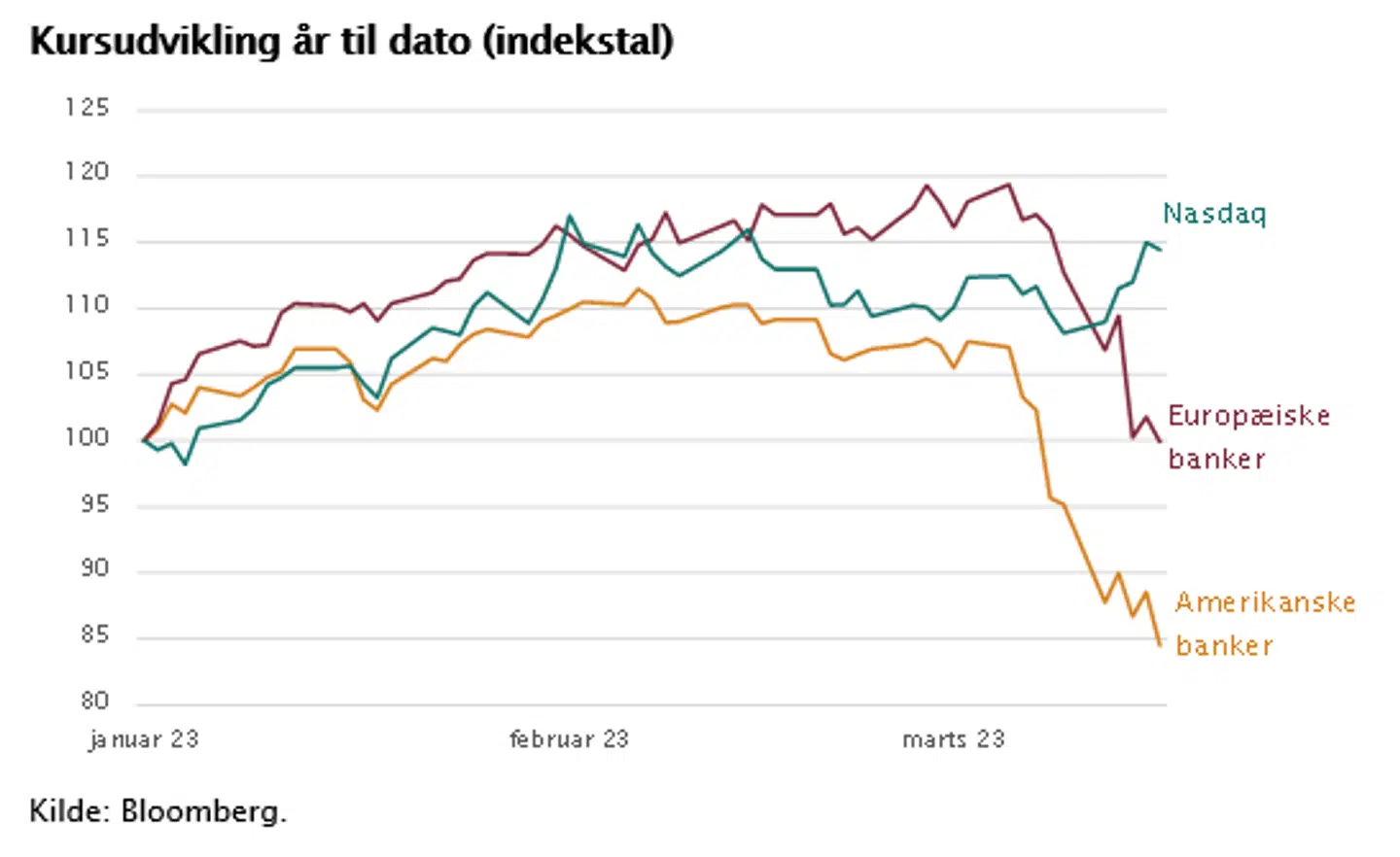 Bankaktierne faldt kraftigt i kølvandet på nyhederne. Det var ikke blot de kriseramte bankaktier, men bankaktier som helhed, der faldt tilbage. Faldene kan forklares med en stigning i frygten for indlånsflugt og recession, der vil ramme bankernes indtjening. Her er det dog vigtigt at understrege, at bankerne som helhed er velkapitaliserede og ikke bør få brug for yderligere kapital til at stå imod eventuelle pres på indlånsmassen. Underliggende er der faktisk noget, der taler for en forbedret indtjening i banksektoren som helhed. Global vækst er tiltagende, og de generelt højere renter vil forbedre