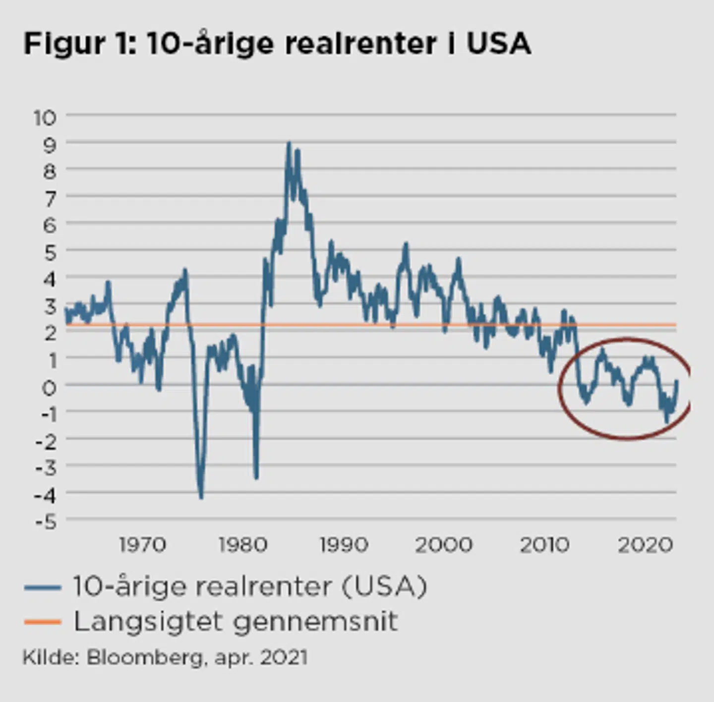 Rentestigningen har også præget aktiemarkedet, men for en langsigtet investor er dette ikke ”Breaking News”, men er mere en normalisering af renteniveauet, herunder niveauet for realrenterne (dvs. renten fratrukket inflationen). Som det ses af figur 1, faldt realrenten i USA i 2020 til omkring minus 1 pct. som følge af Covid-19-pandemien.