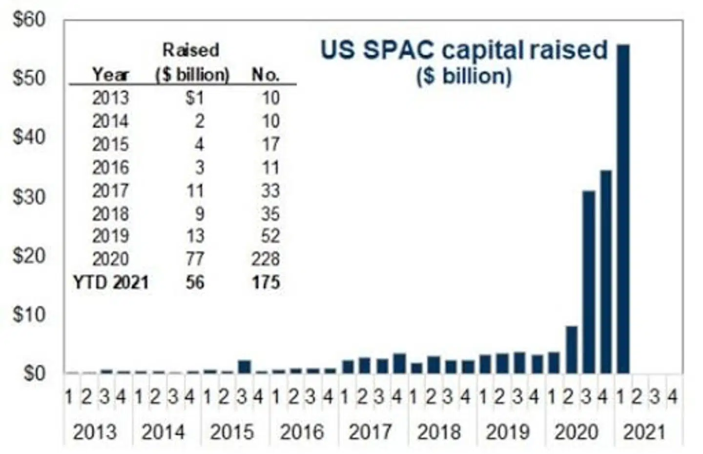 De ovennævnte data tæller kun "reelle" børsnoteringer af nye virksomheder og er således ikke inklusive de mange nye SPAC’s (Special Purpose Acquisition Company). En SPAC er en tom skal, hvor virksomheder kan gå på børsen uden at gennemgå den traditionelle IPO-proces. Konstruktionen har været kritiseret, da investorerne dermed reelt investerer med bind for øjnene.