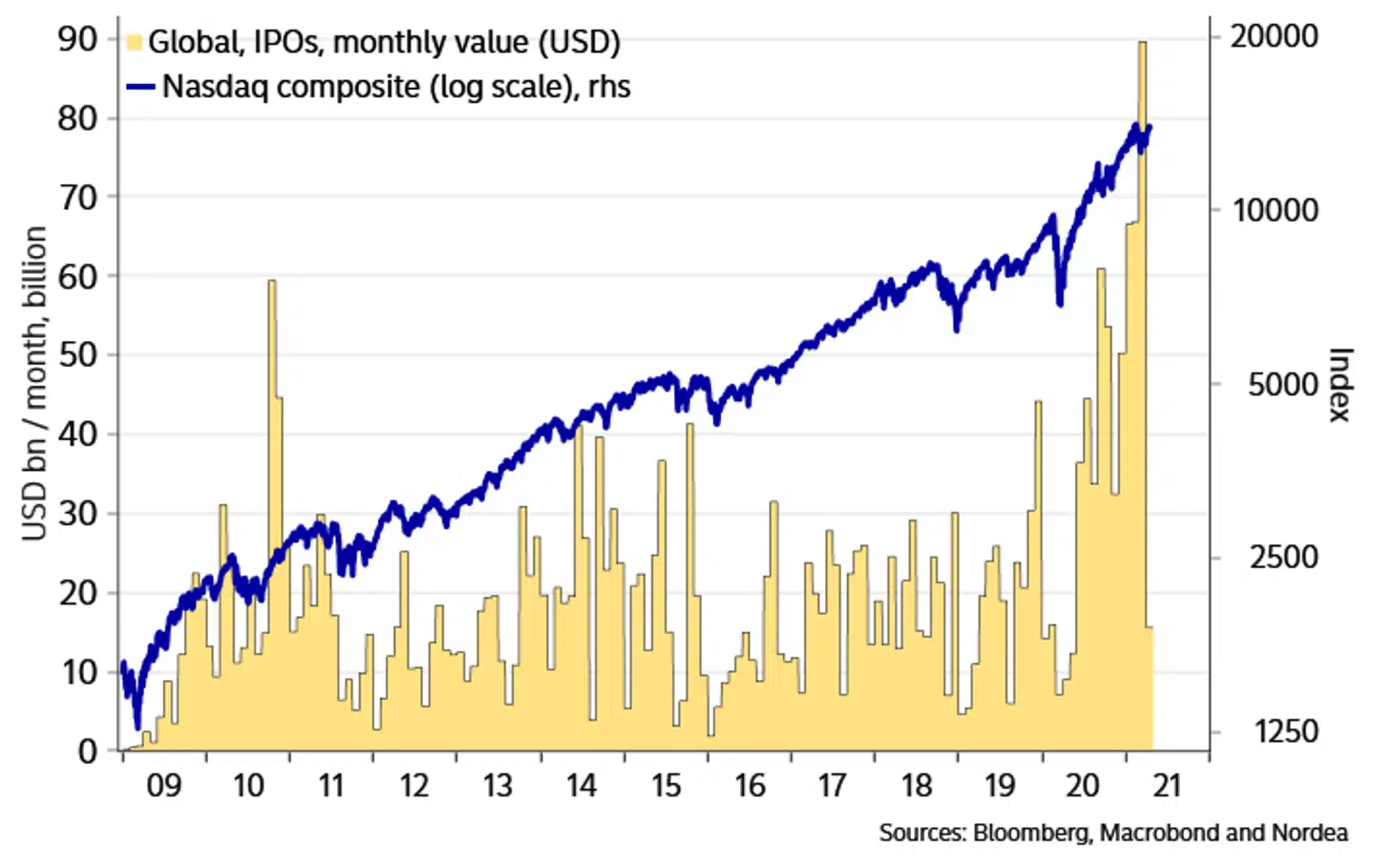 Det, som primært interesserer mig, og som jeg mener er væsentligt er, selve udviklingen, altså ændringen i antal og værdi. Aktuelt er udviklingen accelererende. Som den ovenstående grafik fra Goldmans Sachs- og nedenstående grafik fra Nordea viser, så er noteringer gennem IPO’s og SPAC’s, virkelig taget til i 2. halvår af 2020, og med en øget acceleration ind i 2021. Det vækker min opmærksomhed og bekymring.