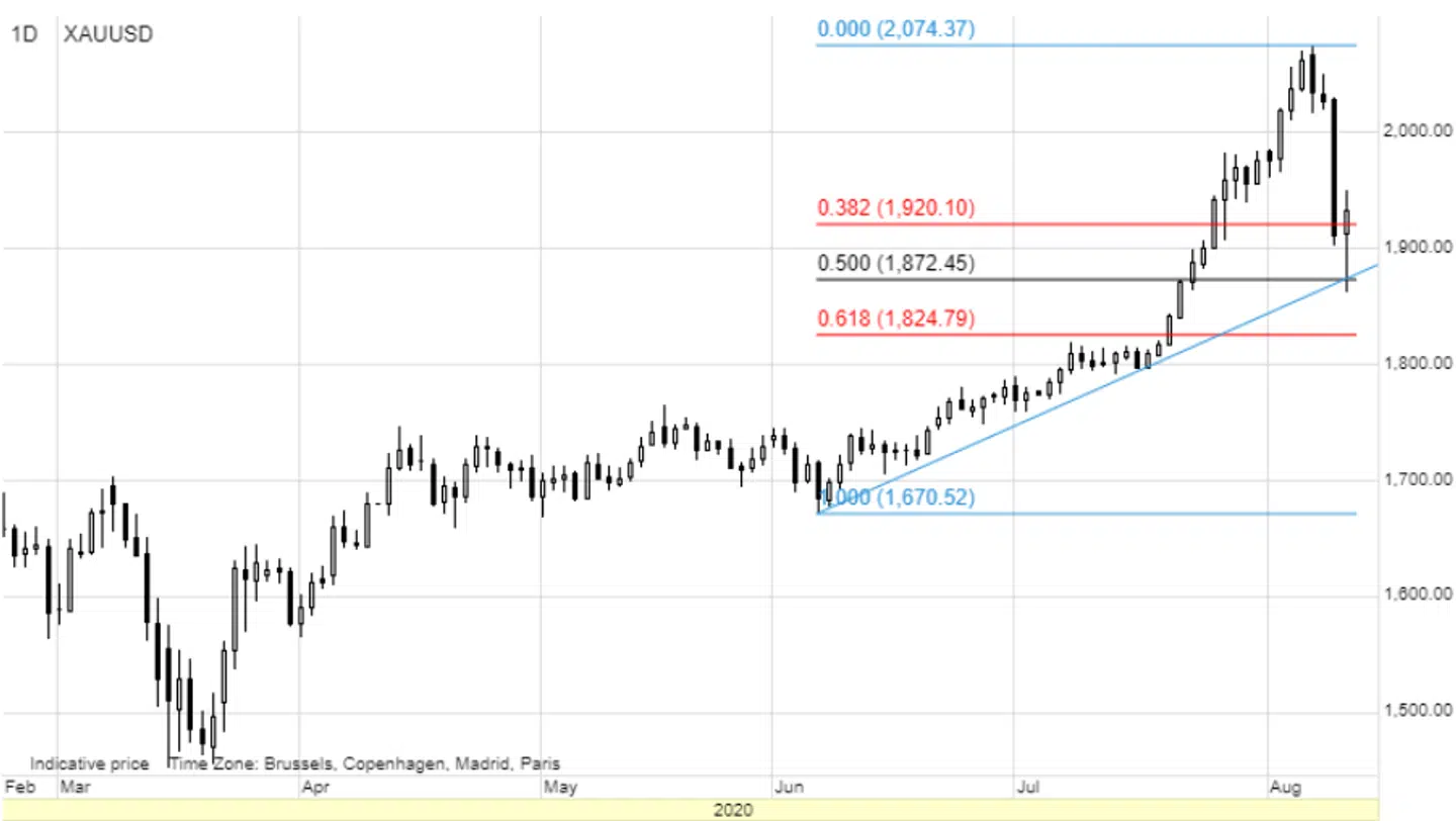 Guldprisen har ikke ligget stille, mens jeg var på sommerferie. Da jeg forlod kontoret i midten af juli, lå prisen i et roligt leje omkring 1800 dollars/ounce. Tre uger senere, da jeg igen sidder ved skrivebordet, er prisen steget mere end 13 pct., hvorefter den igangværende korrektion ramte markedet og sendte prisen tilbage i lejet omkring 1930 dollars/ounce – en udvikling der indenfor guldprisen betegnes som forholdsvis voldsom.