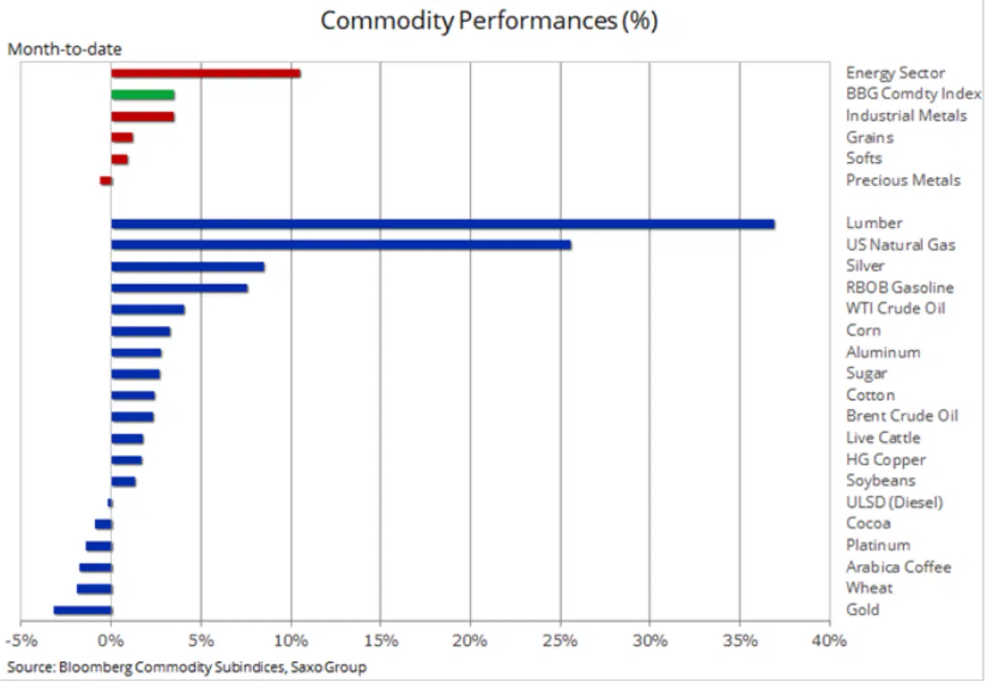 Virksomheder, der tilbyder forbedringer af hjemmet, har siden COVID-19 oplevet en markant fremgang i salget, da folk vælger at kaste penge i huset fremfor at bruge dem i byen. Det, koblet med rekordlave renter, har givet byggebranchen et kraftigt skub fremad. Læg dertil Donald Trumps tariffer på canadisk tømmer, og vejen er banet for en optur, der i øjeblikket betyder, at tømmer er oppe med 35 procent i august, hvilket giver den en klar førsteplads blandt råvarerne i august indtil videre.