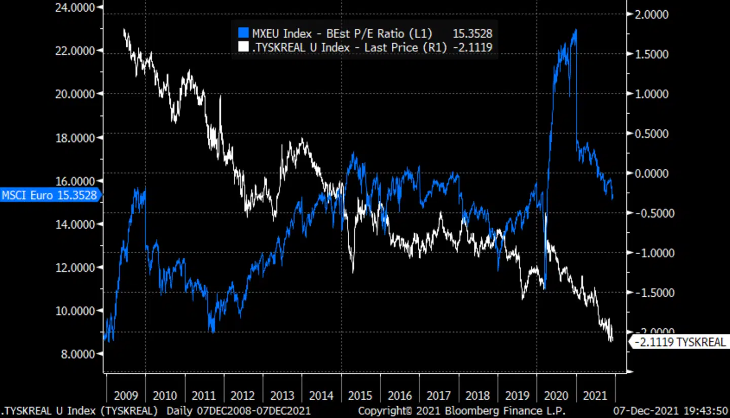 P/E på europæiske aktier og realrente på 10-årige tyske statsobligationer