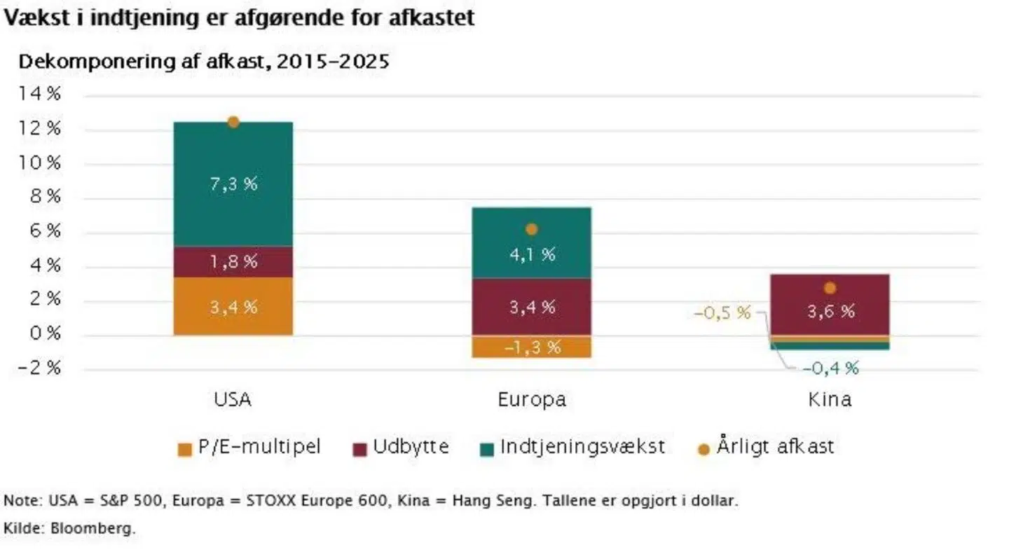 Figuren nedenfor viser det samlede afkast på aktier i regionerne mellem 2015 og 2025 fordelt på vækst i indtjening, udbytter og højere værdiansættelse (P/E-multipel). Her bliver det tydeligt, at vækst i indtjening er afgørende for at skabe afkast.
