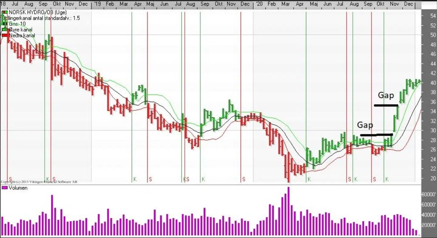 Det meste af 2020 var et kedeligt år for aktionærerne i Norsk Hydro og man skulle helt hen til november, før kursen kom over udviklingen fra januar 2020. På dagsniveauet er der netop etableret et salgssignal i Bollingerkanalen, mens det lange glidende gennemsnit på 24 dage ligger i niveauet 39 som en støttelinje.