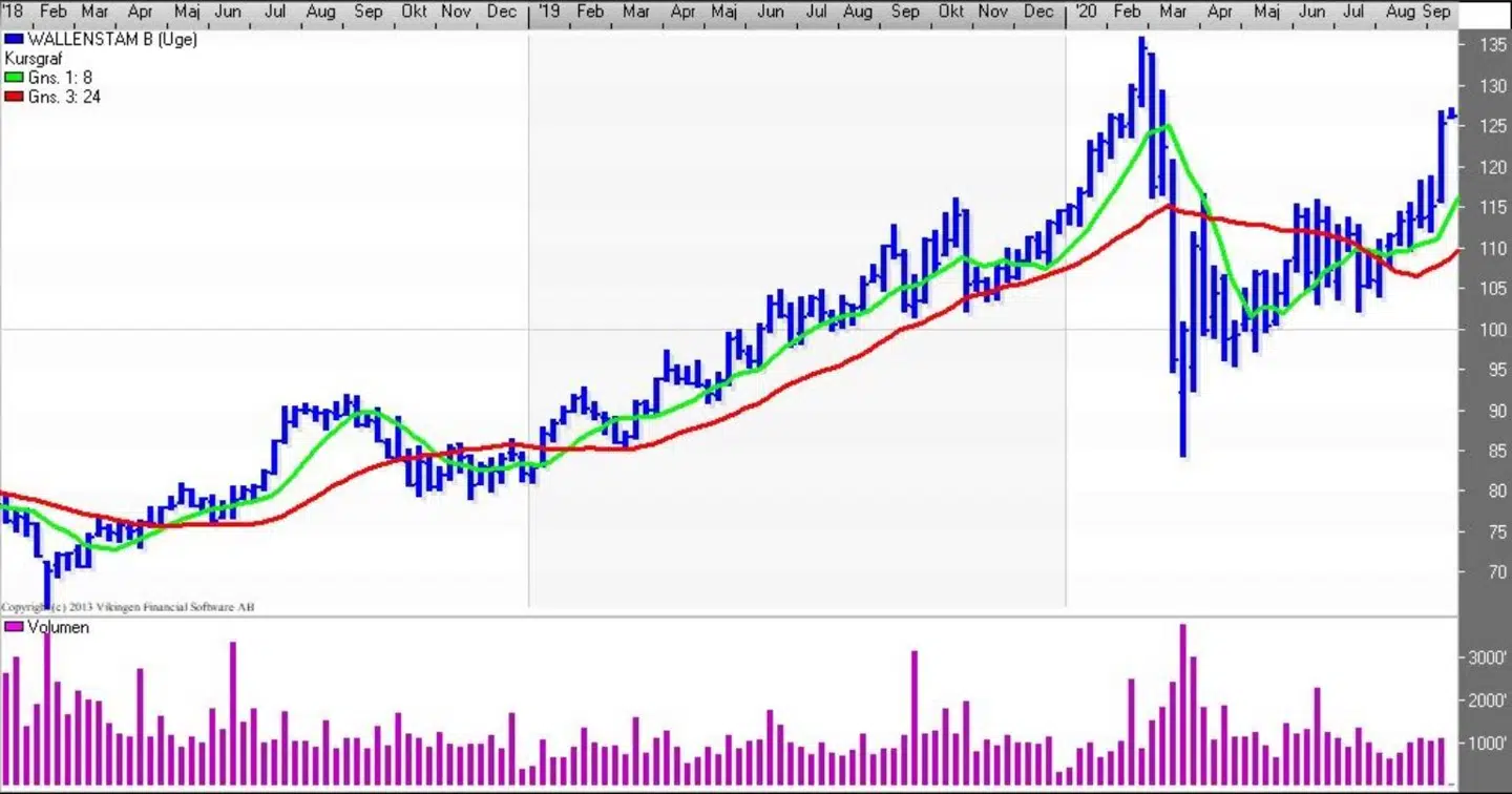 Wallenstam har etableret købssignal for 5 uger siden og de glidende gennemsnit har etableret et ”Golden Cross” for 7 uger siden den positive tendens. Den positive tendens på ugebasis har trukket op i de tre indikationsmodeller på ugebasis.