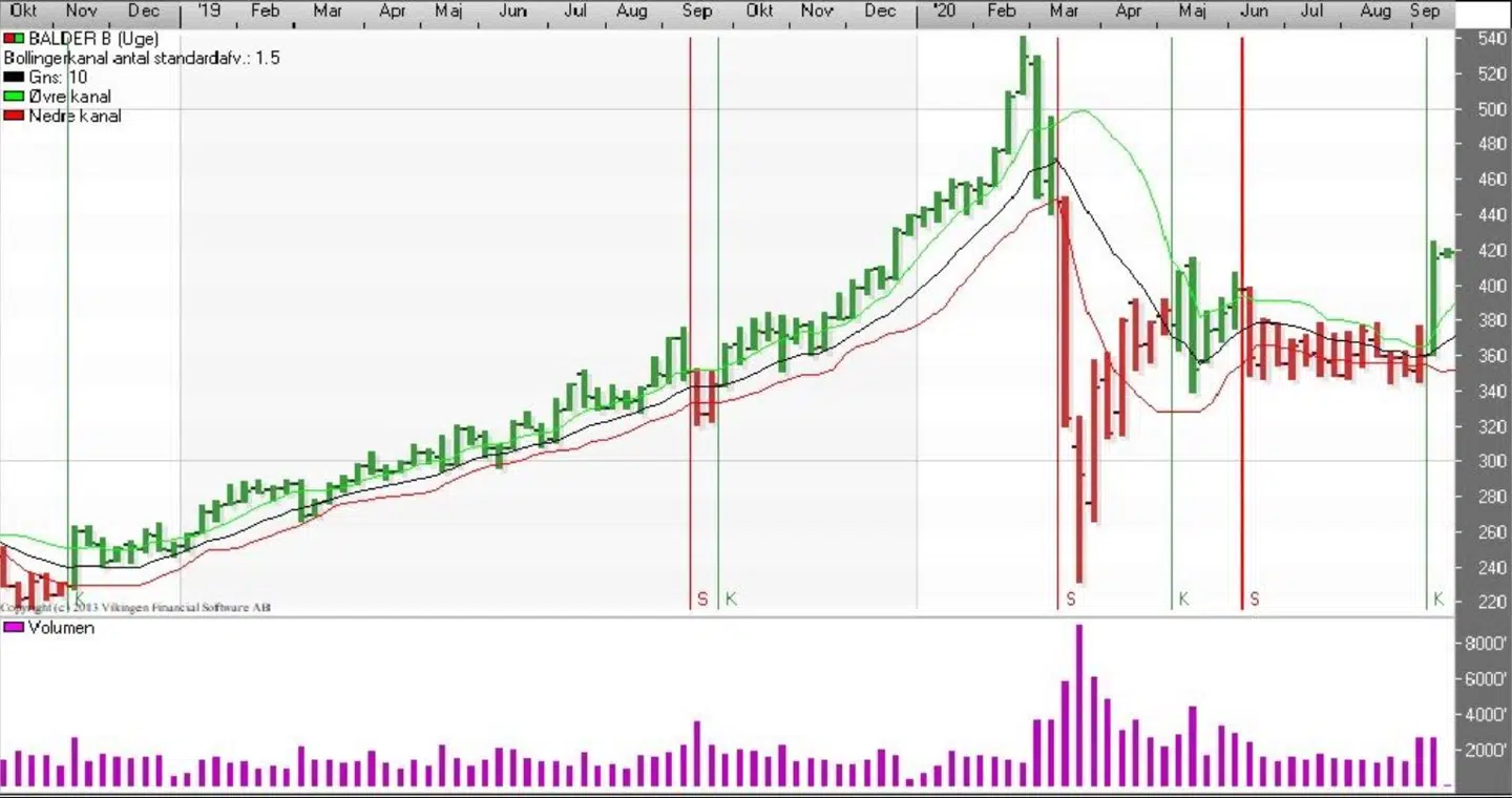 Balder har etableret købssignal for 8 dage siden i Bollingerkanalen. Aktiekursen er gået fra 360 til 415. De glidende gennemsnit etablerede et ”Golden Cross” for 4 dage siden. Den positive tendens ses også i de tre indikationsmodeller, som alle stiger på ugebasis.