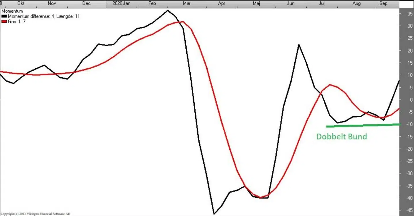 De glidende gennemsnit 8 og 24 uger har endnu ikke etableret et ”Golden Cross”. Den positive tendens i aktiekursen trækker op i de tre indikationsmodeller på ugebasis. Momentum er stigende, men ikke brudt igennem det glidende gennemsnit nedefra endnu. Til gengæld er der etableret en dobbelt bund i Momentum på ugebasis. RSI har ramt niveauet 50.
