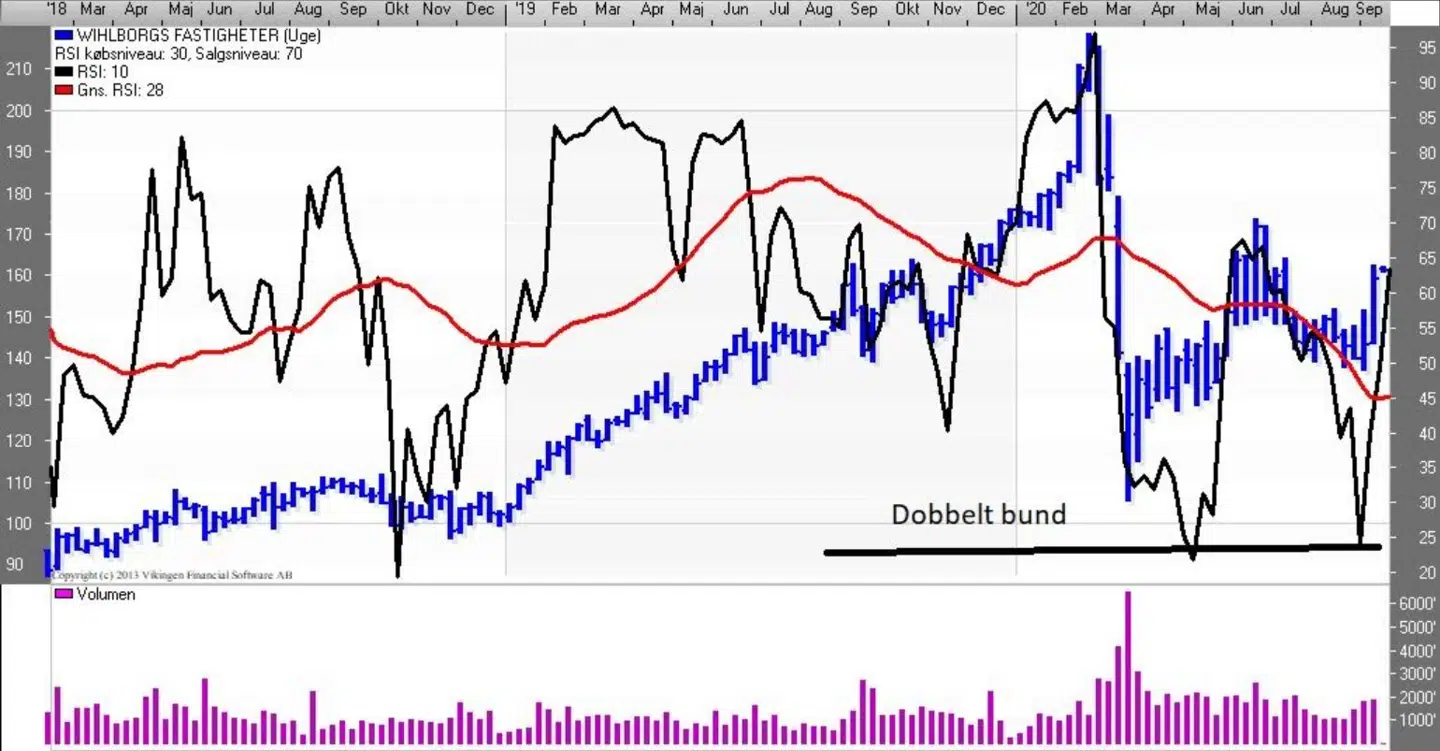 Wihlborgs Fastigheter har etableret købssignal på dagsniveauet i både Bollingerkanalen for 7 dage siden og for 2 dage side etablerede de glidende gennemsnit et ”Golden Cross”. Den positive tendens i aktiekursen betyder, at der er etableret købssignal i flere modeller bl. a. i Bollingerkanalen, hvor den nedre kanallinie ligger i niveauet 142,3 og bliver det niveau brudt, etableres der et salgssignal.