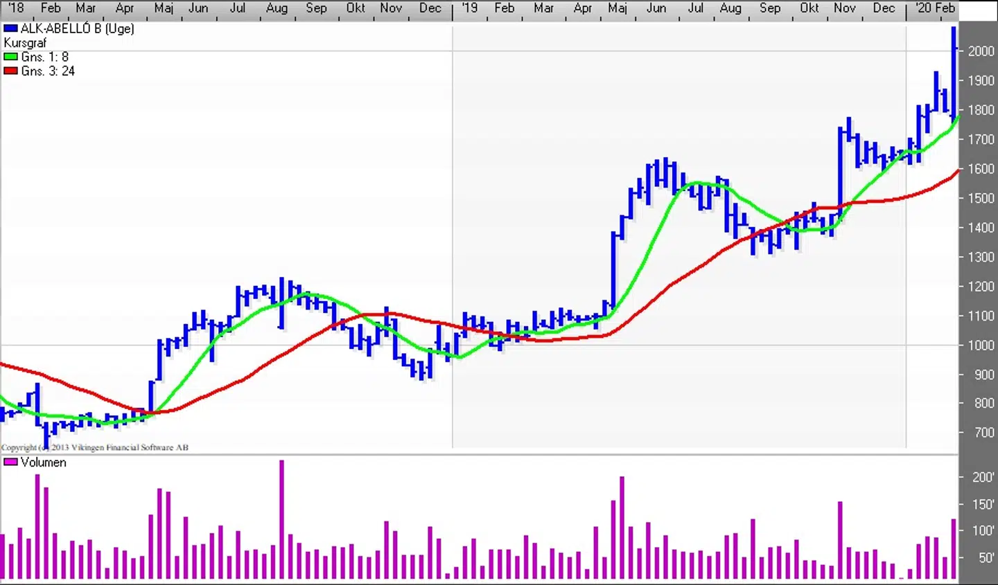 ALK-Abelló har de seneste par gange haft pæne stigninger i forbindelse med fremlæggelse af deres regnskab og onsdag i denne uge var ikke nogen undtagelse. Aktien gik fra 1800 til 2000 og er siden handlet i det niveau.