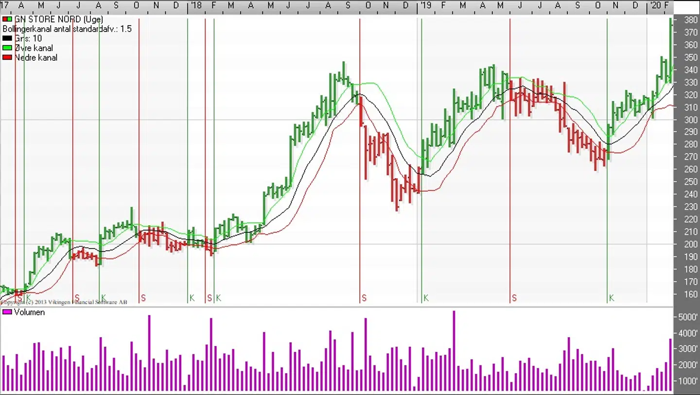 GN Store Nord har siden slutningen af oktober været i en stigende tendens. Dengang blev de glidende gennemsnit brudt nedefra og 4-5 uger efter blev der etableret et ”Golden Cross” på ugebasis og Bollingerkanalen etablerede købssignal ved månedsskiftet oktober/november.