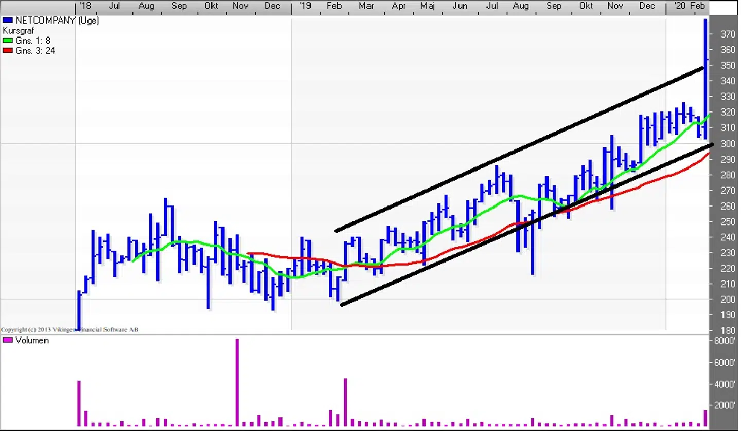 NetCompany blev børsnoteret tilbage i 2018. I begyndelsen bevægede aktien sig meget vandret i niveauet 200-240, men i midten af 2019 blev det modstandsniveau brudt og testede en enkelt gang i august 2019.