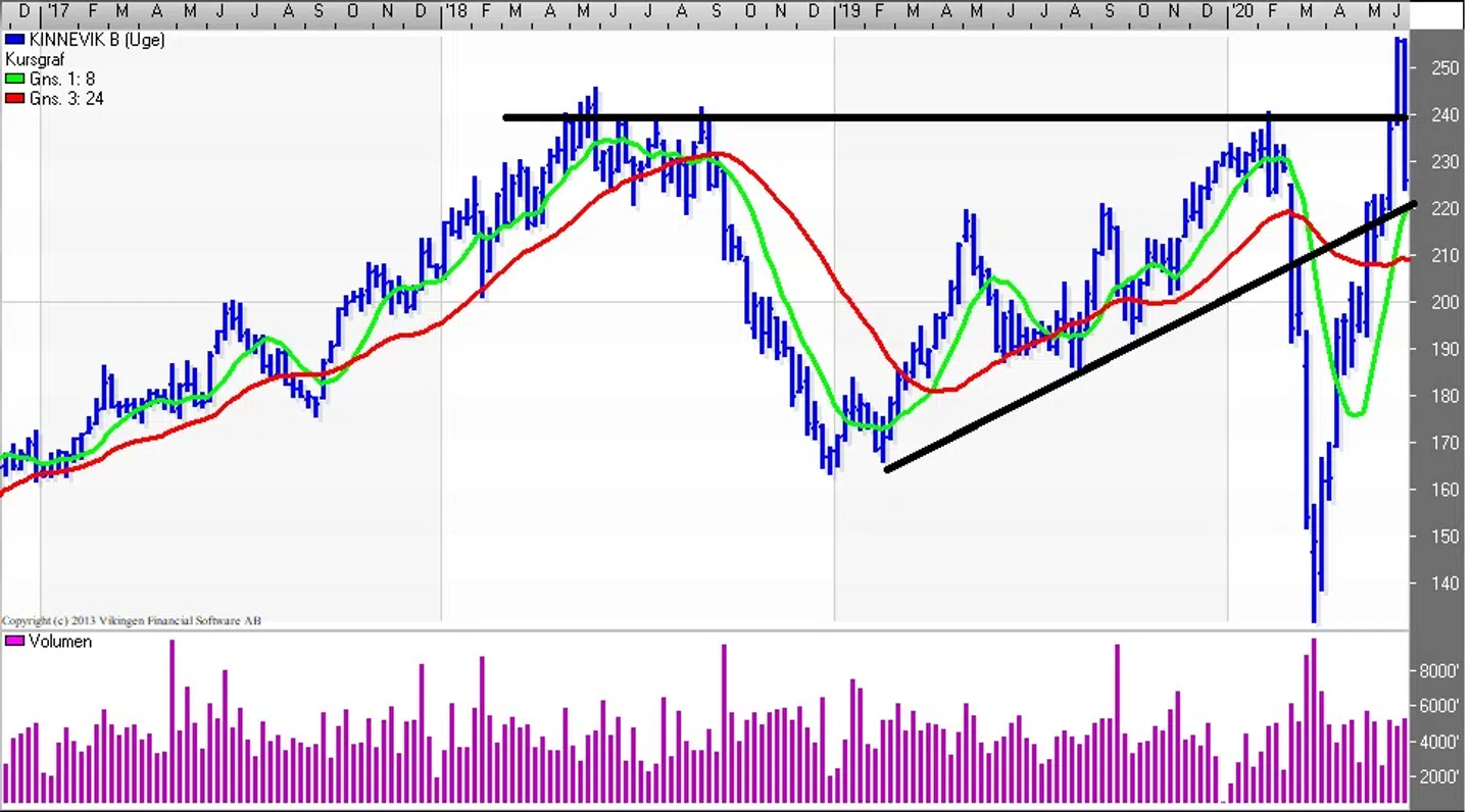 Kinnevik brød forrige uge den gamle topformation ved 240, men denne uge er aktien sendt tilbage og har i første omgang fundet støtte i niveauet omkring 220, som tilbage i januar og februar var et modstandsniveau i den stigende trendkanal.