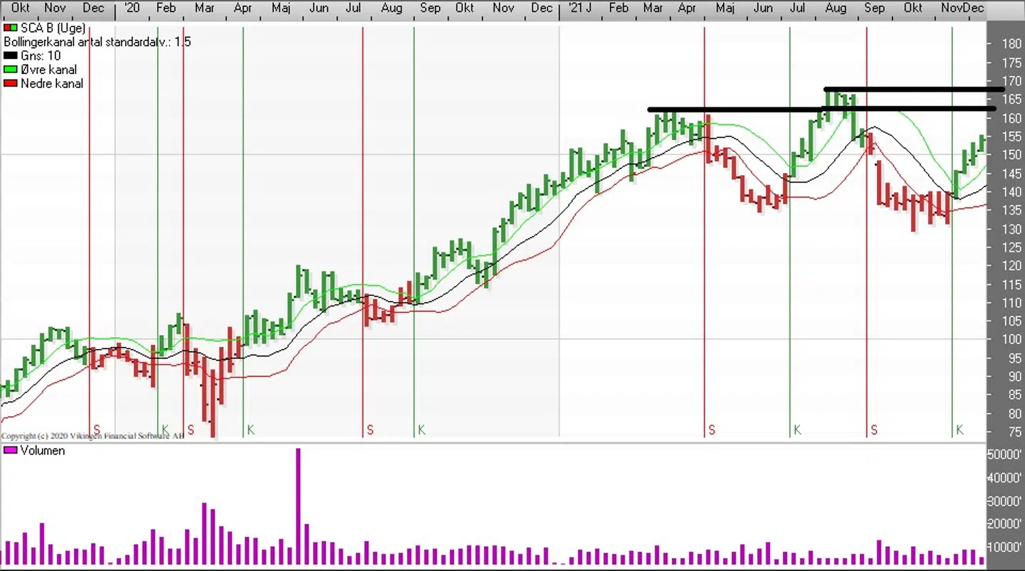Den positive tendens i SCA-aktien trækker op i Momentum, MACD og RSI på ugebasis. MACD er over 0 og RSI har ramt 80.