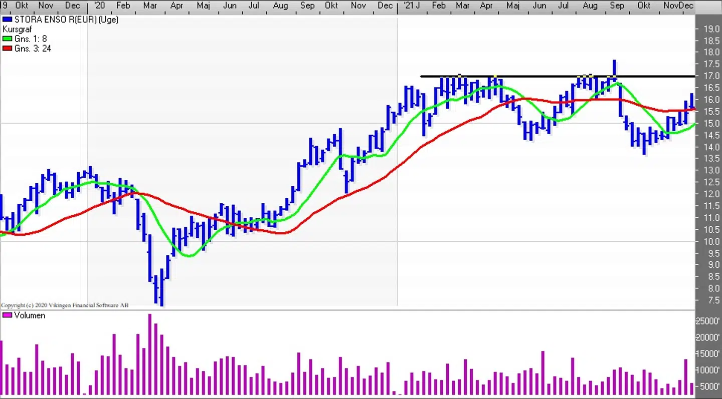 Aktien i Stora Enso fandt en bund i oktober i niveauet 14 – 14,5 hvor Bollingerkanalen etablerede et nyt købssignal på dagsniveauet. De glidende gennemsnit etablerede et ”Golden Cross” i midten af oktober og siden har det lange glidende gennemsnit på 24 dage ligget som en støttelinie under kursudviklingen.