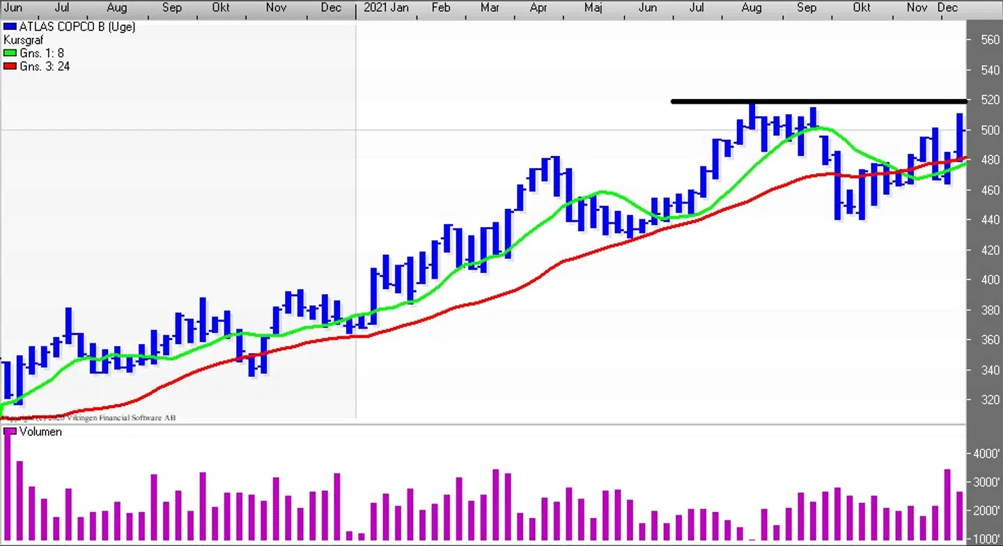 Det er tredje gang at modstandsniveauet 510 – 515 bliver testede. Atlas-aktien ser interessant ud ved brud af modstanden.