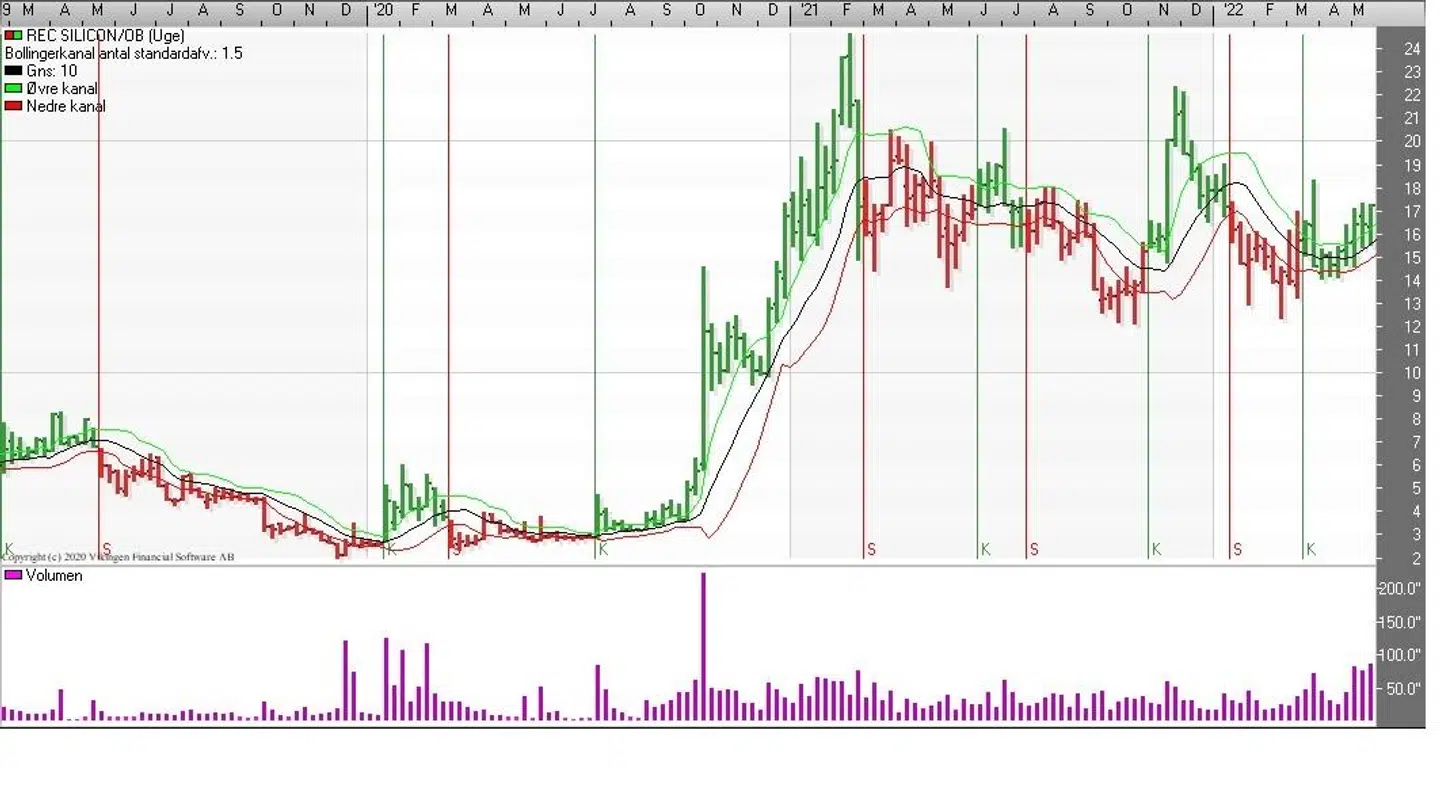 Aktiekursen i REC Silicon har været i en stigende tendens siden bunden i februar, hvor aktien blev handlet i 12,5-13, mens aktien lukkede i 17,25 fredag. De glidende gennemsnit har etableret et ”Golden Cross” i slutningen af april og Bollingerkanalen er gået i køb i fredags efter en enkelt dag i salg.