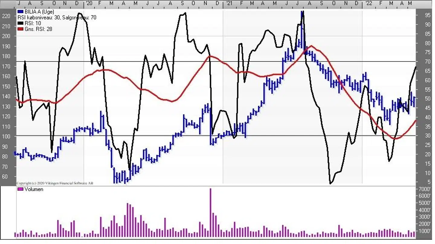Bilia-aktien toppede i juli i niveauet 220 og i marts ramte aktiekursen 111,5 og fredag lukkede aktien i 139,30. Dermed er der en stigende tendens i kursudviklingen og det betyder, at Bollingerkanalen har etableret et købssignal på dagsniveauet og de glidende gennemsnit har etableret et ”Golden Cross” for 6 dage siden.