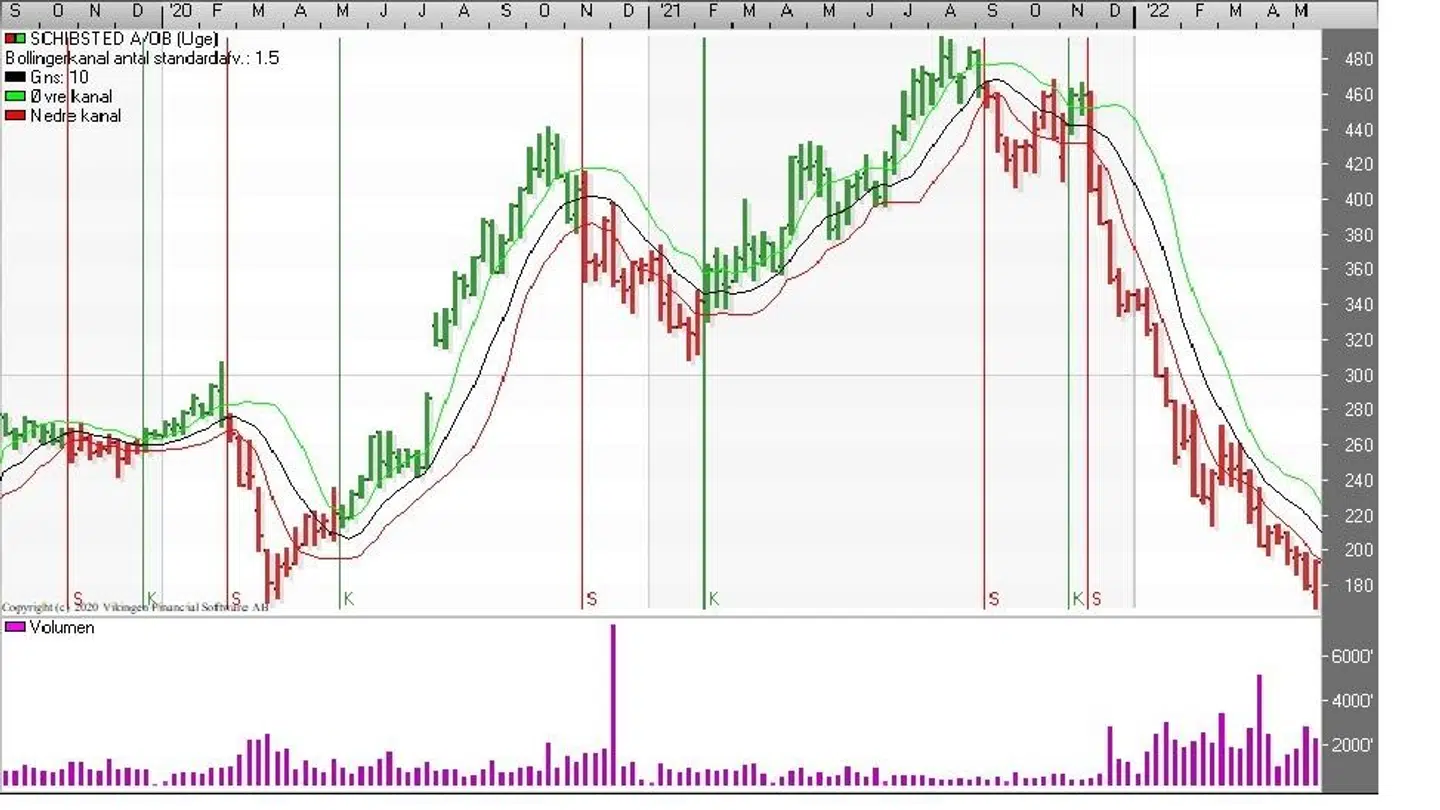 Schibsted-aktien er faldet fra toppen i august, hvor kursen var 480 og fredag sluttede kursen i 193,9. På dagsniveauet har Bollingerkanalen etableret et købssignal efter at have været i salg siden midten af marts.