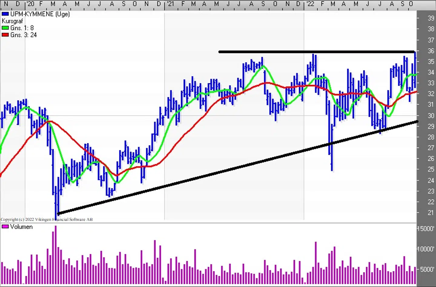 På dagsniveauet er der etableret et købssignal i Bollingerkanalen for 8 dage siden, og de glidende gennemsnit har netop etableret et Golden Cross. Den positive melding fra UPM skabte et gap i niveauet 33,43-34,52.