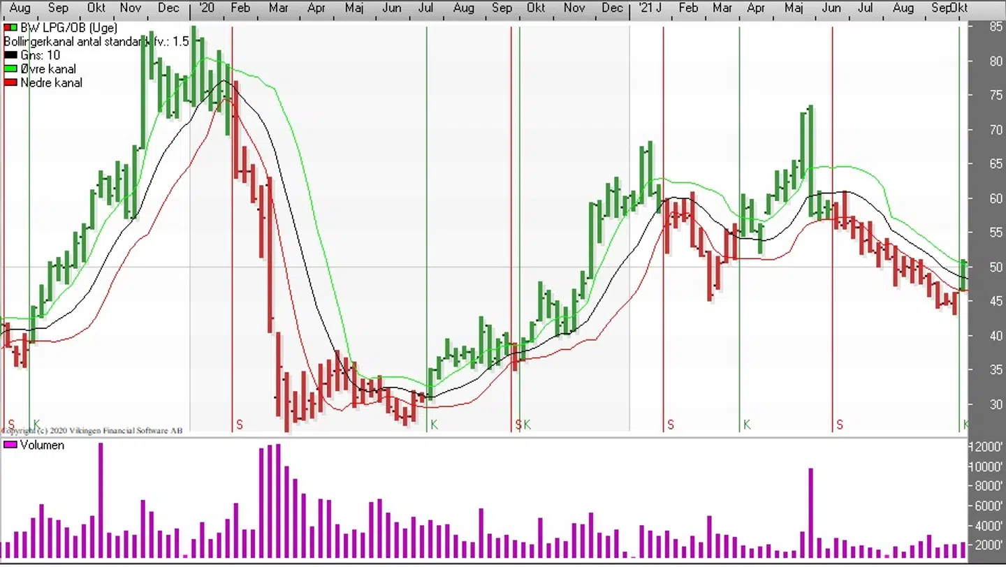 Aktien i BW LPG toppede i 73,45 i maj måned og har siden været i en faldende tendens og kursen ramte 43,12 i sidste uge, og siden er aktien steget og handles nu i niveauet 50,80. På dagsniveauet blev der etableret et købssignal i slutningen af september i Bollingerkanalen og de glidende gennemsnit på dagsniveauet har etableret et ”Golden Cross” torsdag. Et ”Golden Cross” bliver etableret, når det korte glidende gennemsnit skærer igennem det lange glidende gennemsnit nedefra. En stigende omsætning i aktien vil bekræfte det positive signal. Det ser man også i BW LPG på dagsniveauet. På ugebasis er Bollingerkanalen gået i køb efter kursen er brudt over den øvre kanallinie, der lå i kursniveauet 50.