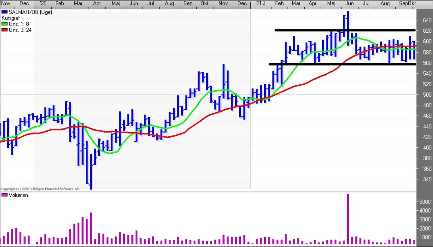Der er ikke sket meget med Salmar-aktiekursen i år efter stigningen fra årets begyndelse og frem til februar. Aktien handles i niveauet 550-600. Den vandrette formation har fået signalmodellen Bollinger til at skifte signal flere gange mellem køb og salg og for to uger blev det igen til et købssignal.