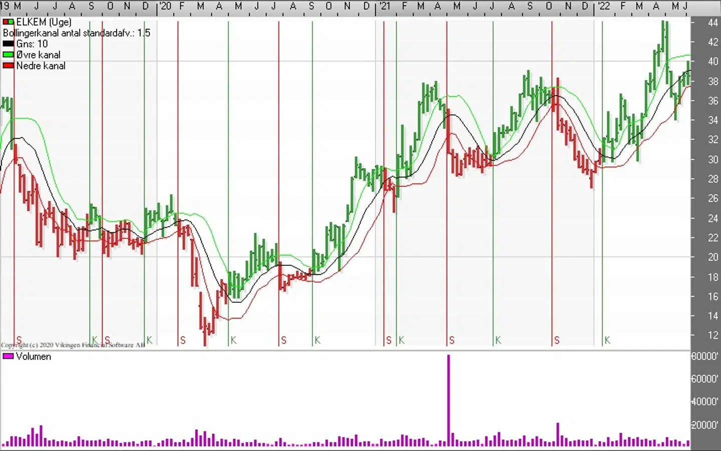 På ugebasis blev der etableret købssignal i begyndelsen af januar i Bollingerkanalen og de glidende gennemsnit etablerede i slutningen af april et ”Golden Cross”.