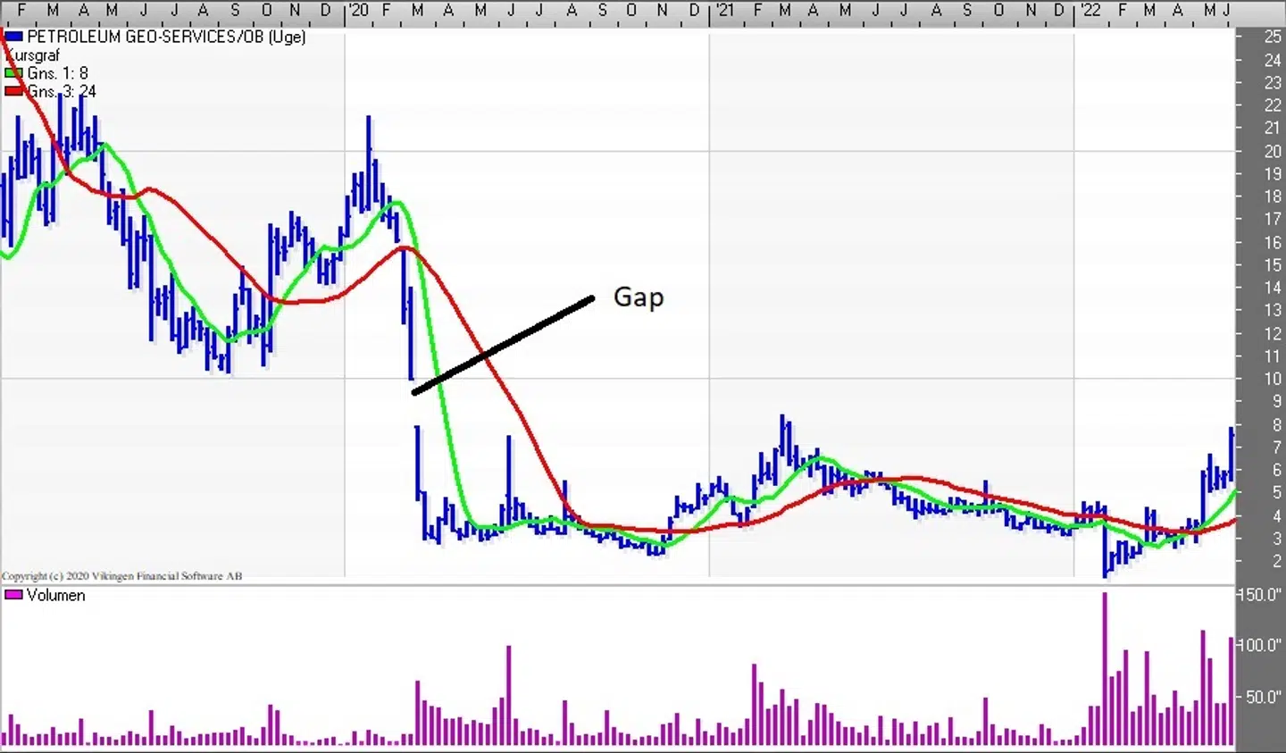 Petroleum Geo-Service fandt en bund i slutningen af januar i niveauet 1,26-1.70 og fredag lukkede kursen i 7,53. Aktien er i år steget med 105,04 pct. I marts 2021 blev modstandsniveauet 8 testet, men der var ikke nok Momentum i aktiekursen til at bryde igennem. Der er en række huller, gaps, i grafen både på dags- og ugeniveauet og det er både under og over det nuværende kursniveau. Disse gaps skal lukkes over tid.