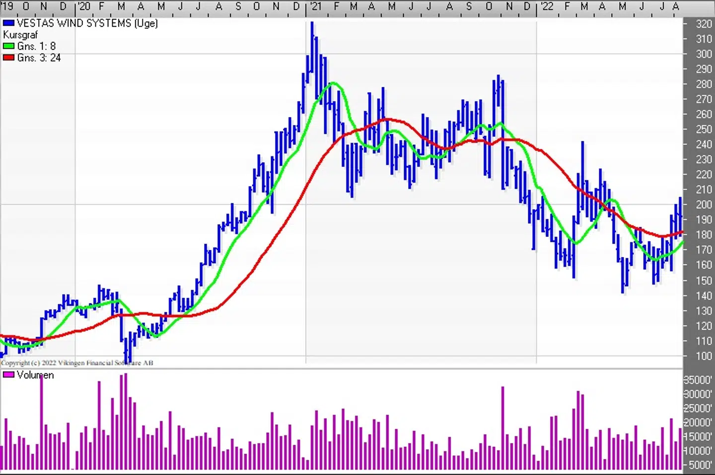 På dagsniveauet er der i Vestas-aktien et købssignal i de glidende gennemsnit på 8 og 24 dage, da det lange glidende gennemsnit ligger over det korte glidende gennemsnit og det har stået på siden midten af juli.