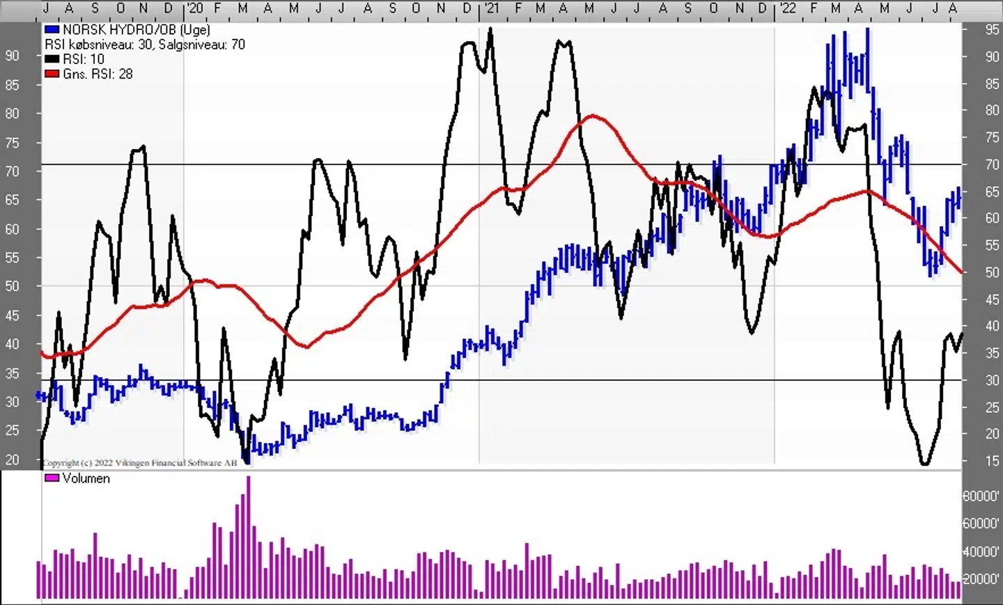 Norsk Hydro-aktien etablerede i marts/april en dobbelt top formation i niveauet 94 og har siden været i en faldende tendens og ramte niveauet 51,64 i juli, mens aktien fredags lukkede i kurs 65,52.