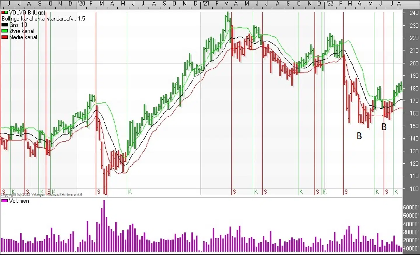 Volvo-aktien har etableret en stigende tendens fra bunden i maj, hvor kursen var i 150 i maj og herefter har der været i en bund i 155 i midten af juli. Toppen var i juni i niveauet 180 og nu handles aktien i niveauet omkring 185.