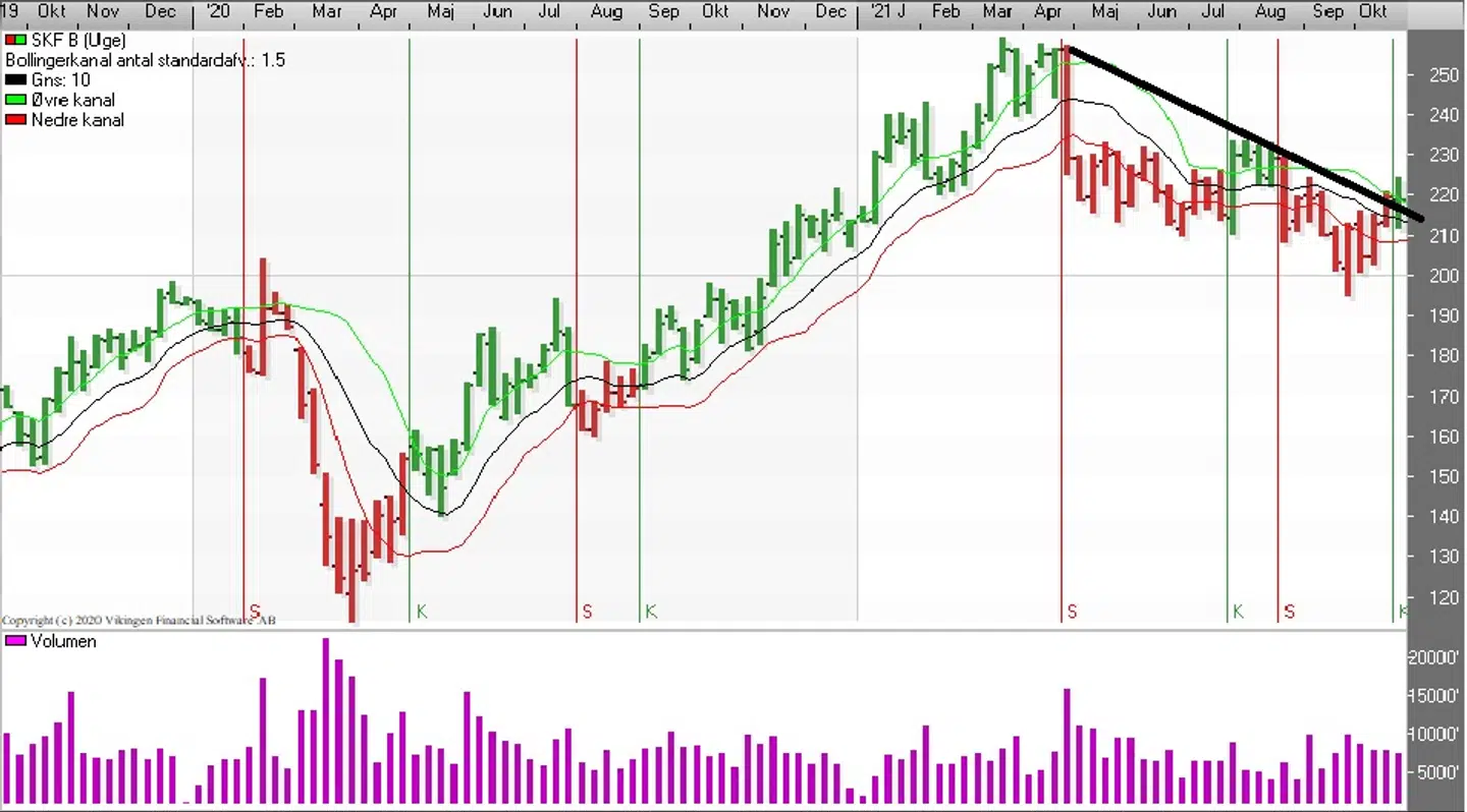SKF toppede i marts/april i niveauet 260 og siden har aktien været i en faldende tendens, og der blev i første omgang fundet en bund i niveauet 200 i slutningen af september. Fredag lukkede aktien i 219, og der er etableret en svagt stigende tendens i aktiekursen.