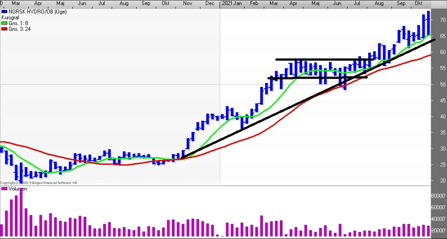 Aktien i Norsk Hydro holder fast i den stigende tendens efter en mindre konsolidering i perioden april til slutningen af juni, hvor aktiekursen har bevæget sig vandret i niveauet 50-55.