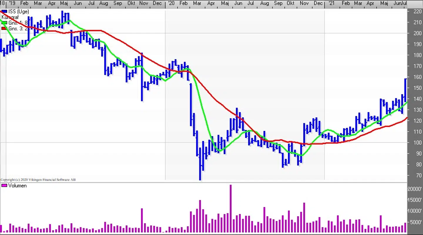 ISS har været i en stigende tendens siden oktober hvor aktien blev handlet i niveauet 80 og fredag lukkede aktien i 158,55. På dagsniveauet er der ligeledes etablerede købssignal for de glidende gennemsnit var det i begyndelsen maj mens den meget volativitet i aktiekursen har fået Bollingerkanalen til at skiftet signal et par gange.