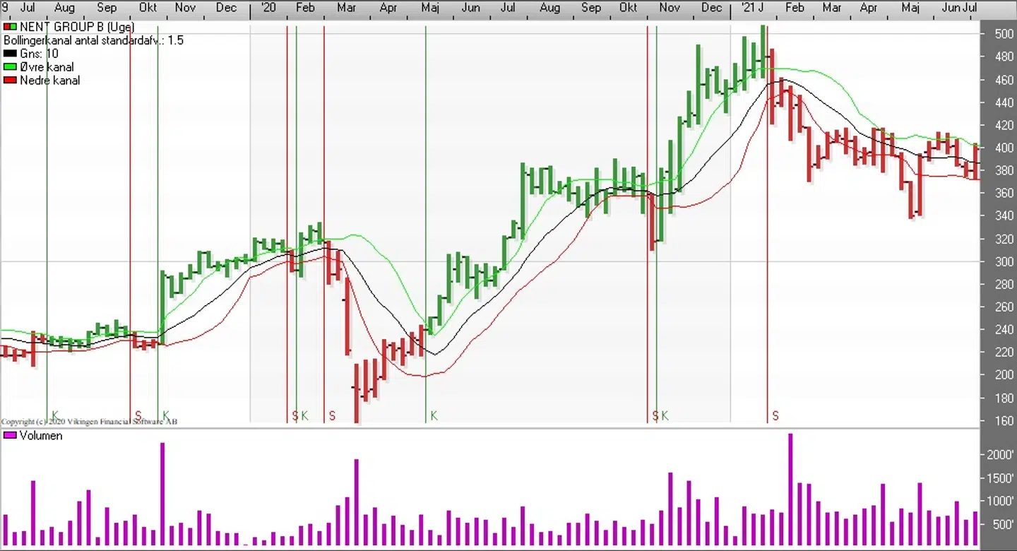 Nent Group toppede i kurs 500 tilbage i januar og siden har aktien været i en faldende tendens frem til maj hvor aktiekursen ramt 340 og herefter tog kursen en rebound op i niveauet 410 hvor aktien nu støder på for 4 gange siden marts. Der er etablerede købssignal i Bollingerkanalen mens de glidende gennemsnit på 8 og 24 dage er blevet brudt nedefra.