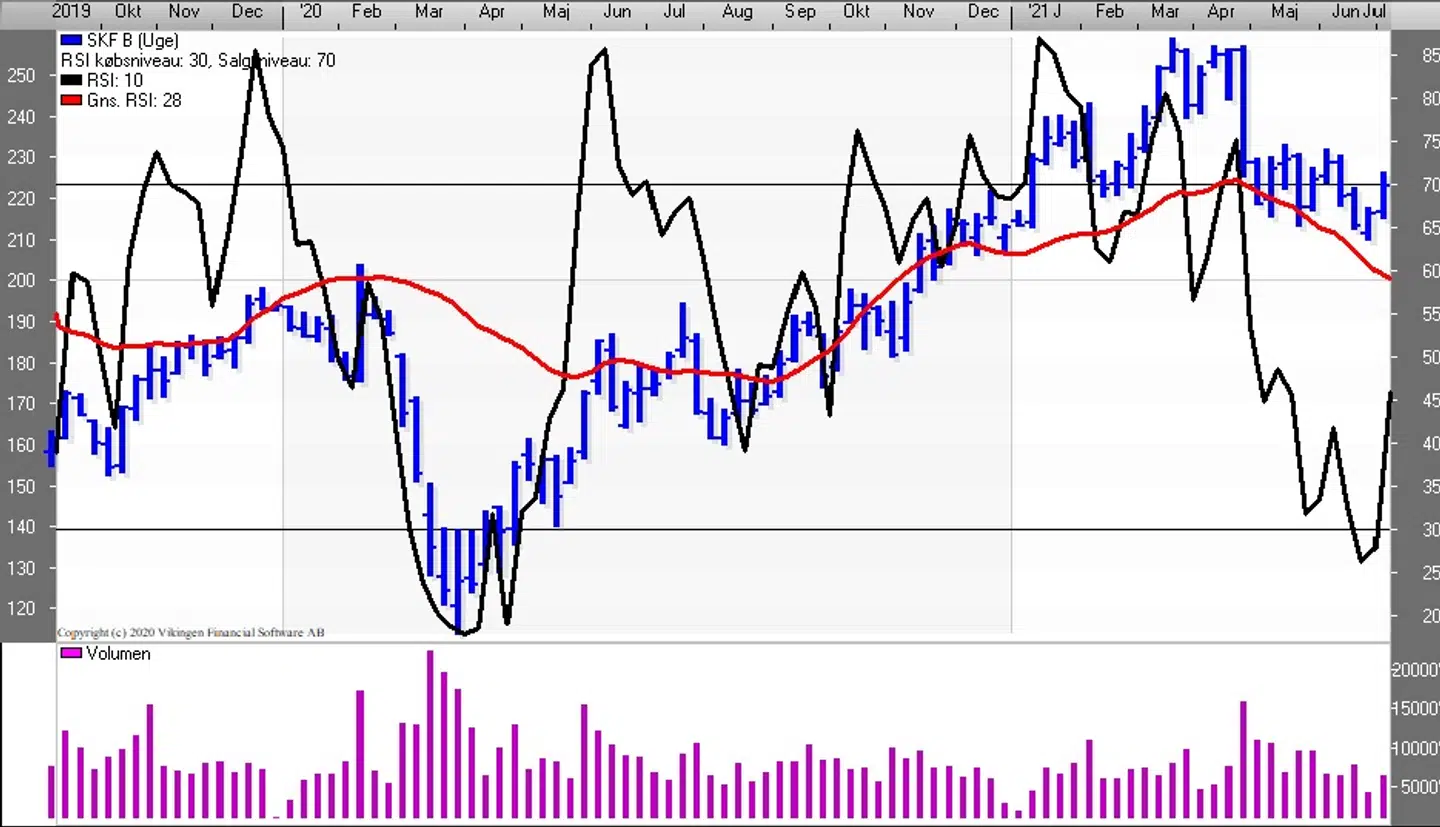 SKF toppede i marts i niveauet 250 – 258 og det blev til en dobbelt top og siden har aktien været i en faldende tendens. I maj og juni blev niveauet 210 – 216 hvilket blev en dobbelt bund og i fredags lukkede aktien i 223,4.